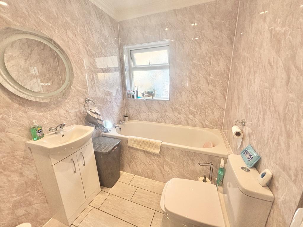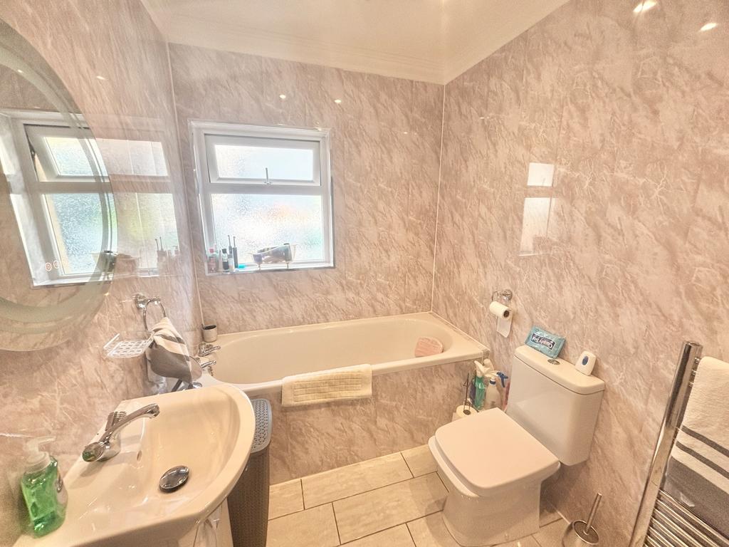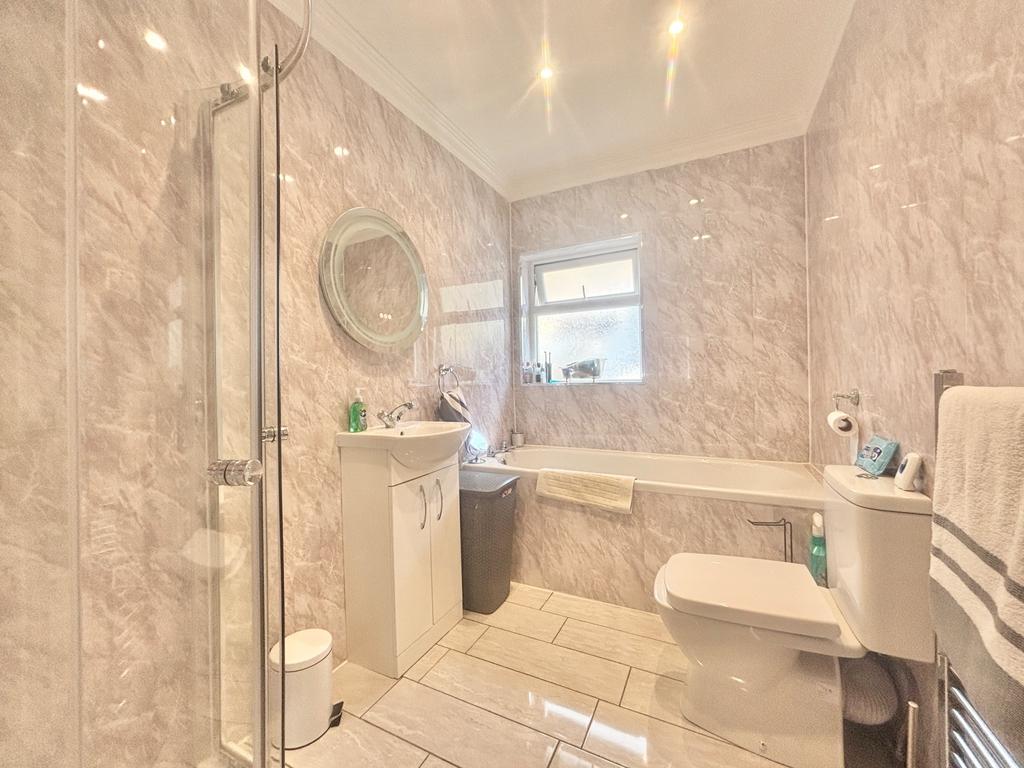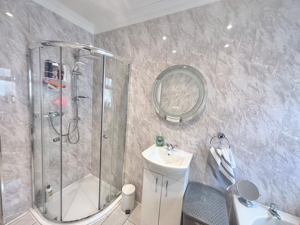 Marble effect tiled floor. Four piece suite comprising WC, WHB with vanity unit, bath and shower enclosure with mixer shower. Ceiling spotlights. Floor to ceiling fitted respatex panels in a marble effect.