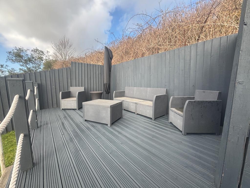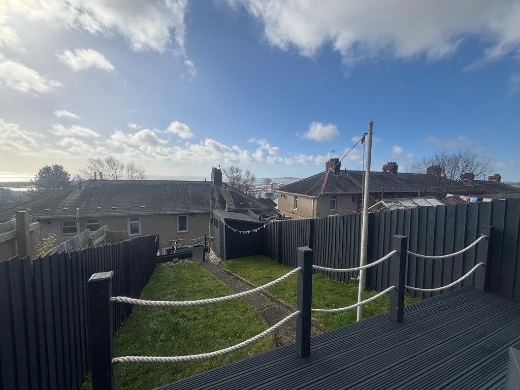 Enclosed rear garden. Steps leading to 1st tier with decked area. Leading through later lawn area to top decking area with views over Swansea Bay. Rear pedestrian access