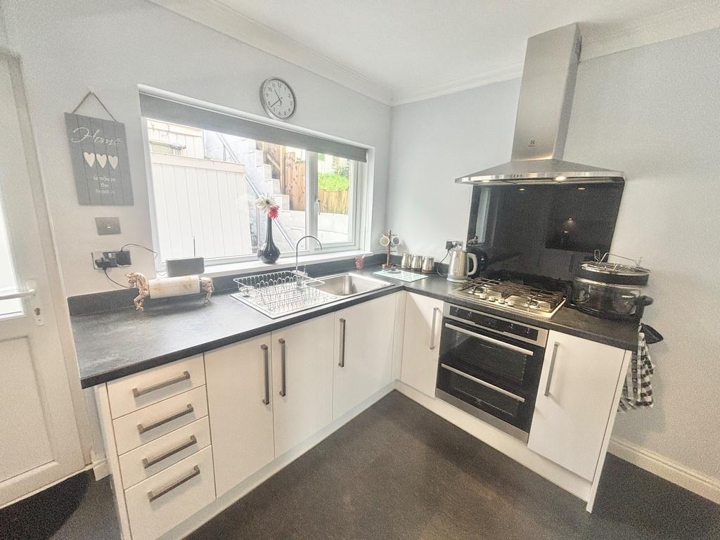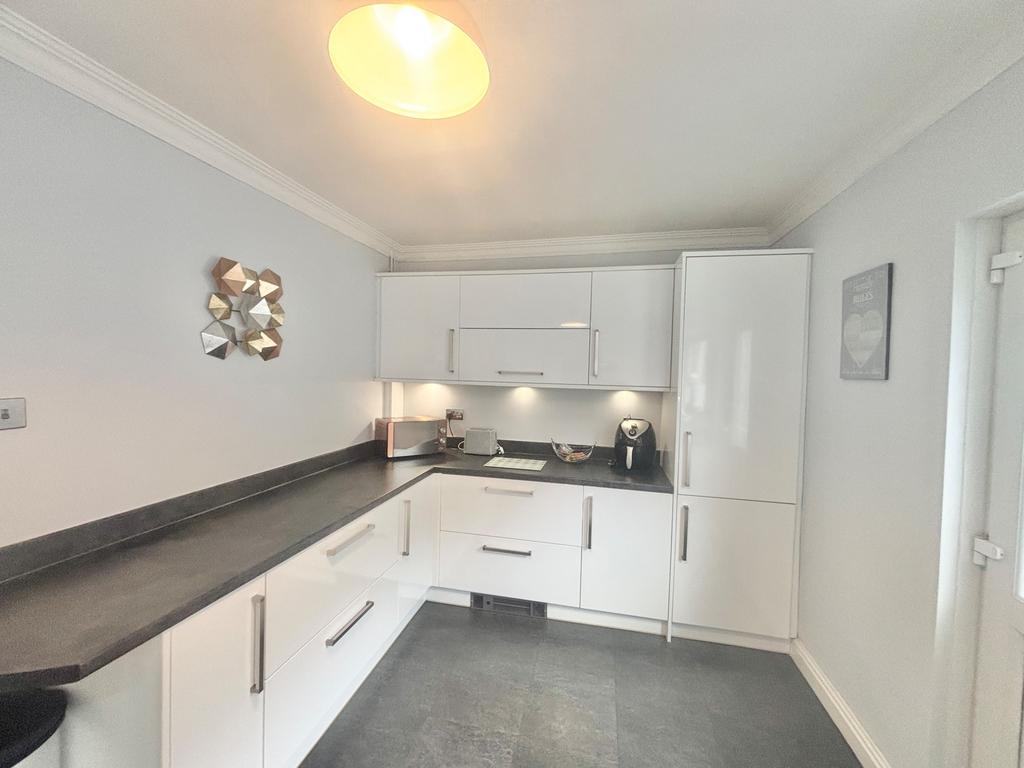 Tile effect laminate flooring. A range of wall and base units in a white glass slab with a slate effect laminate worktop. Stainless steel sink and drainer with mixer tap. Double oven with gas hob and extractor fan over. Integrated fridge freezer and washing machine. Storage cupboard. Power points. Central light fitting. Under unit lights. UPVC double glazed window overlooking rear garden. UPVC double glazed back door with frosted glass. Plinth heater