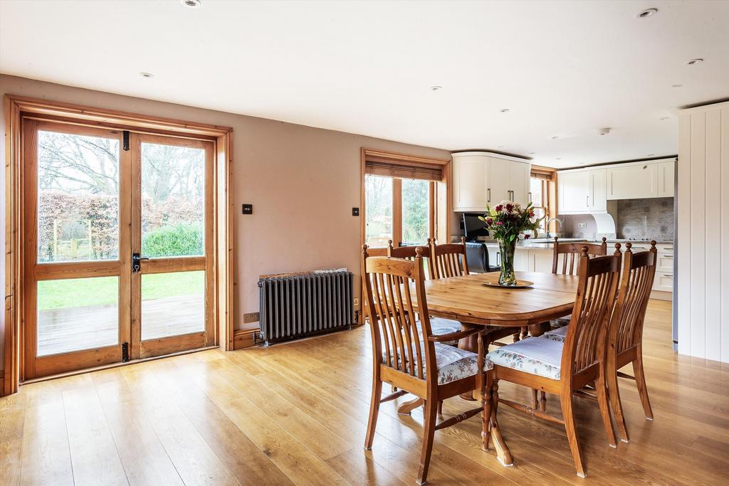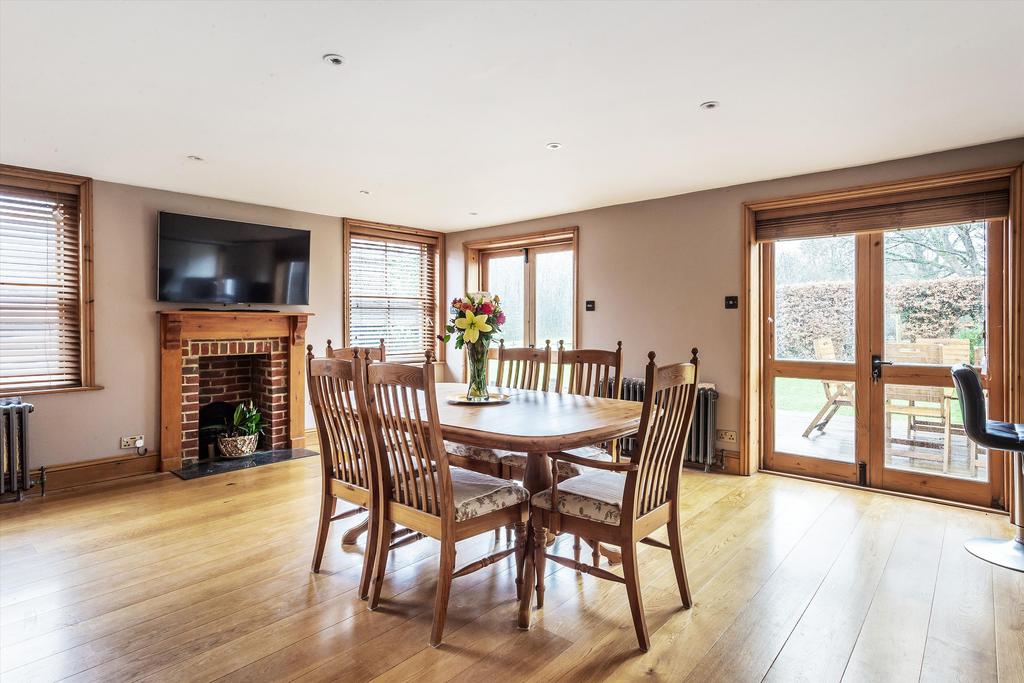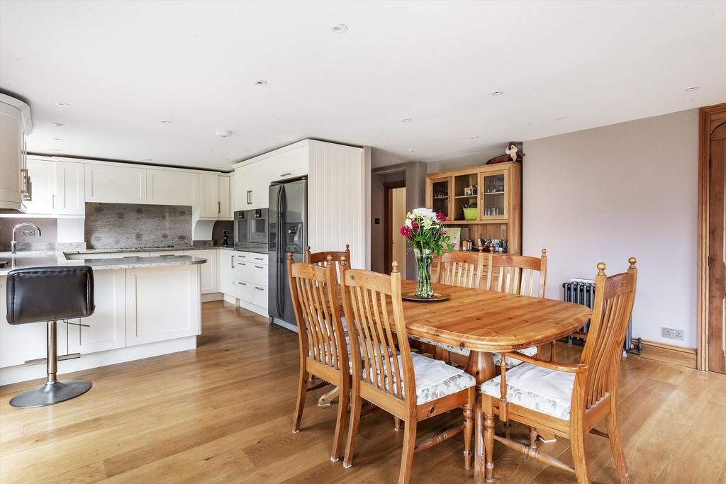 To the rear of the house, the fantastic kitchen/dining room spans the width of the house and has two sets of French doors opening out to the rear terrace and gardens, creating a perfect entertaining space. The beautifully appointed kitchen has a range of modern fitted wall and base units with integrated Gaggenau and Miele appliances, breakfast bar and a window to the rear. From the kitchen, a door leads through to a useful utility room with a door to the side and a shower room off. There is also a separate w.c.