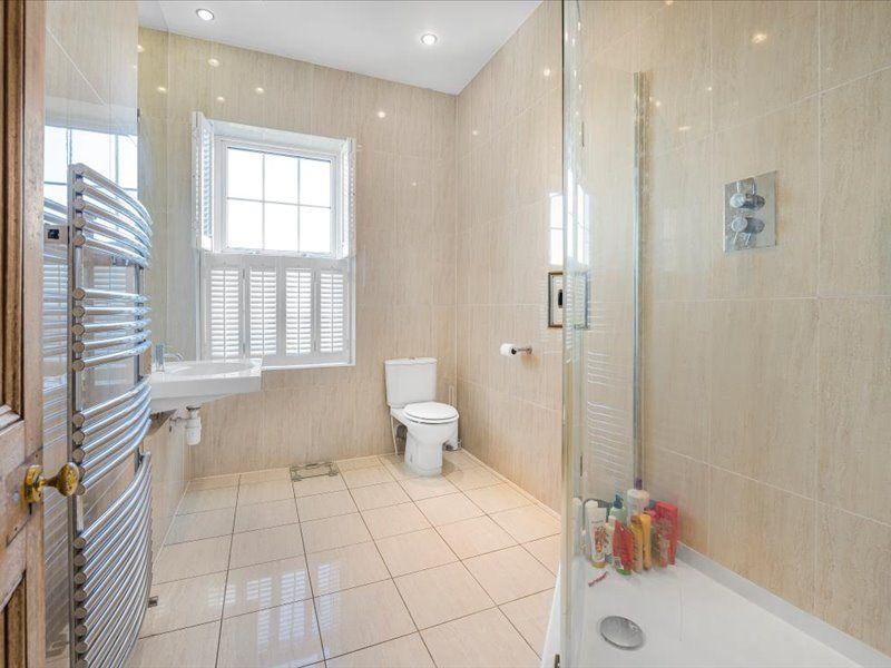 Matching three piece suite with shower, sink and WC. Window to rear. Tiled floor.
