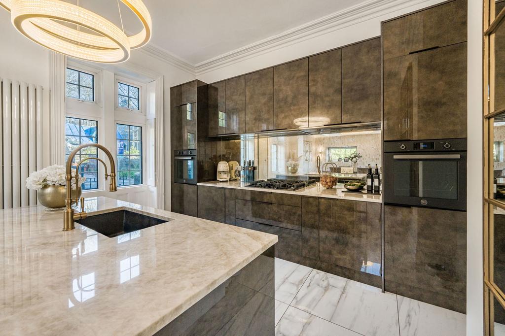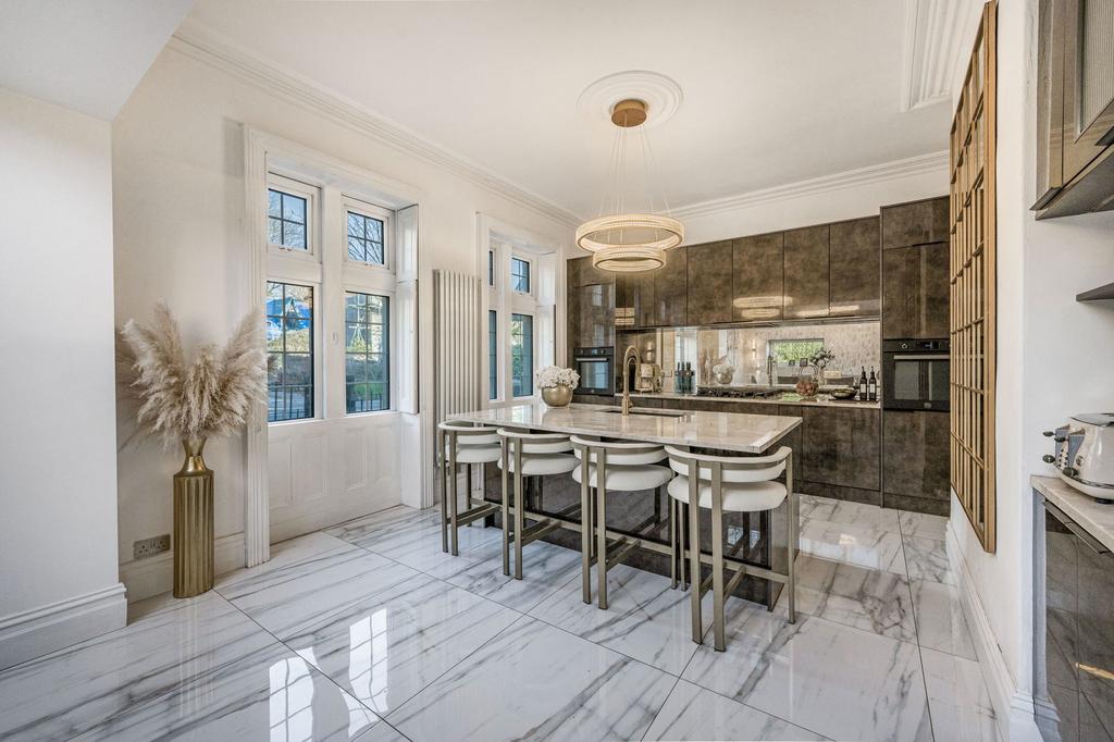A stunning modern kitchen area with matching wall and base units with complimentary granite worktops plus a kitchen island topped with granite with overhang for stools for breakfast bar and integrated Sink and tap. Other Integrated appliances include Fridge, Freezer, and Gas Hob. Space for integrated Dishwasher and 2 x electric oven. 2 x window to front. Tiled flooring. Opening to