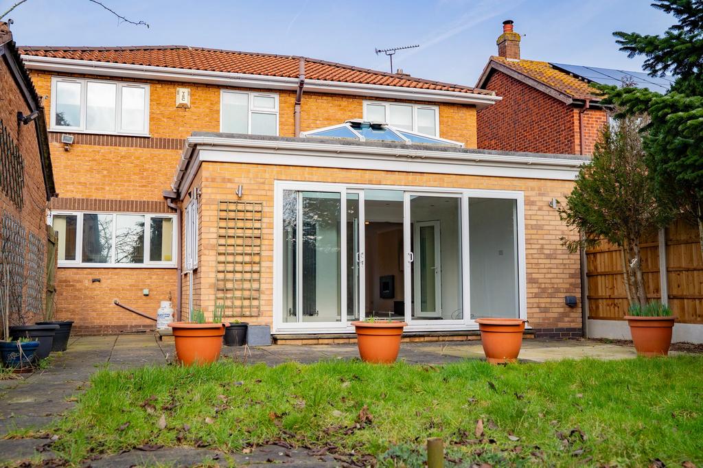 A brick extension with UPVC double opening sliding doors with double glazed matching side panels leading out to the rear garden with a full height door with double glazed windows to either side, all with fitted blinds. Lantern style roof window, Karndean style flooring, two vertical radiators and power points for a wall mounted TV.