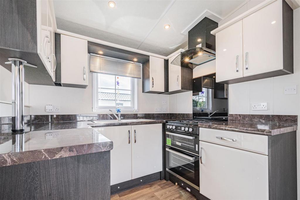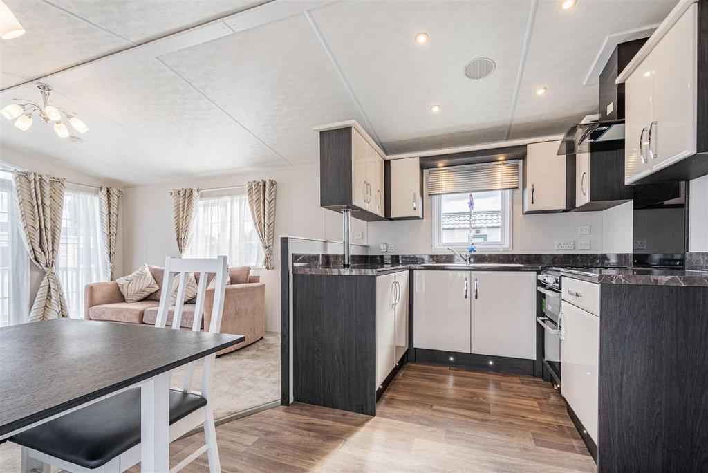 This super park home comprises kitchen with a range of base and eye level units, and integrated microwave, oven and hob and fridge freezer. There is a dining area with table and four chairs and a living room with feature electric fireplace and patio doors onto the decking to the front.