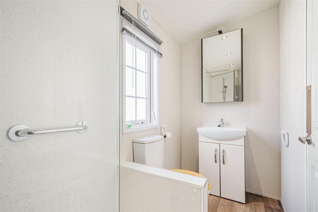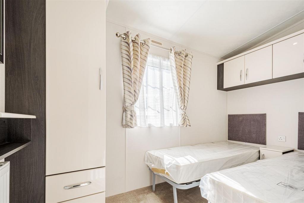 Bedroom two has twin beds, overhead storage and a wardrobe while the main bedroom has a double ottoman style bed, bedside cabinets, overhead storage and built in wardrobes. The bathroom has a low level WC, hand wash basin and large walk in shower cubicle.