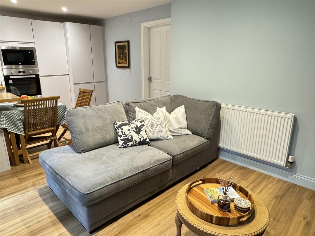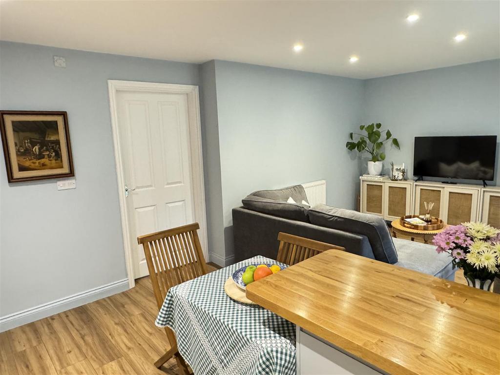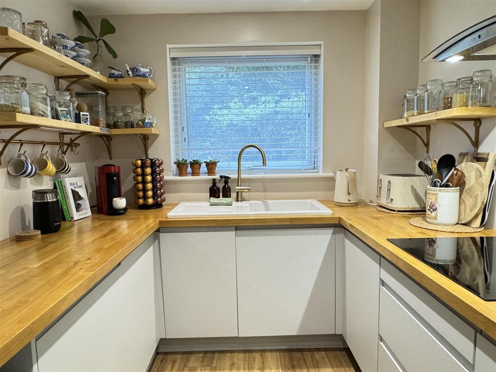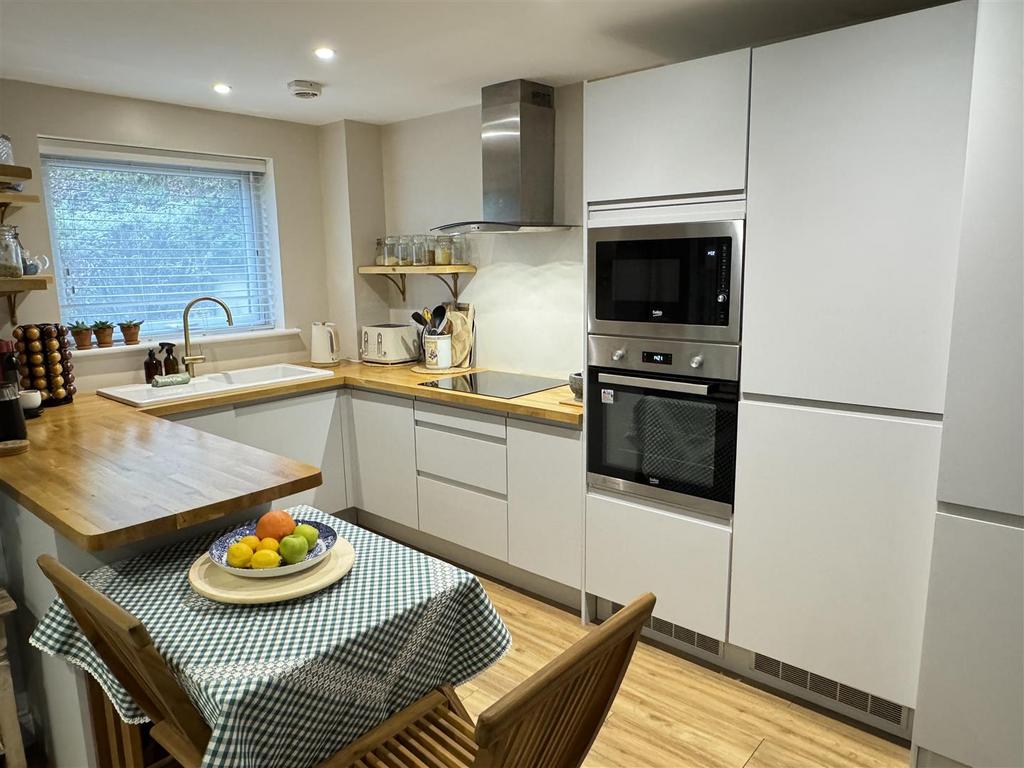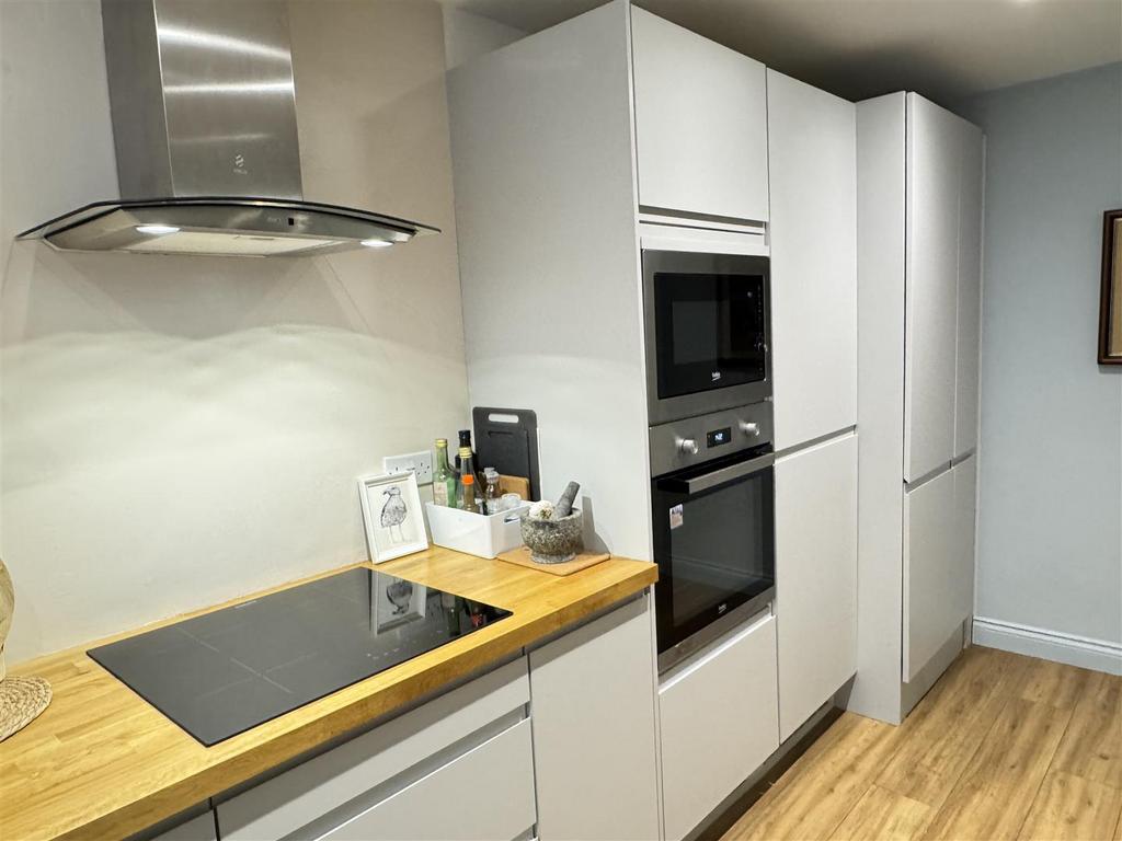 Kitchen/Open Plan Living Area - 5.96 x 4.27 - max (19'6" x 14'0" - max) - Upvc double glazed pation doors provide access to private balcony with full length glazed panels to either side. "L-shape" room. Refitted contemporary kitchen comprising matching base with square edge wood work surface over. Tall units oven, microwave, fridge/freezer, washing machine and tumble dryer. Induction hob. Radiator. TV aerial point. Ceramic sink with matching draining board and central mixer tap.