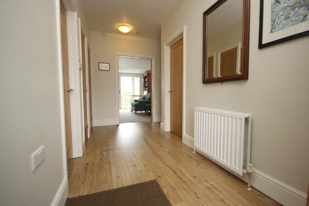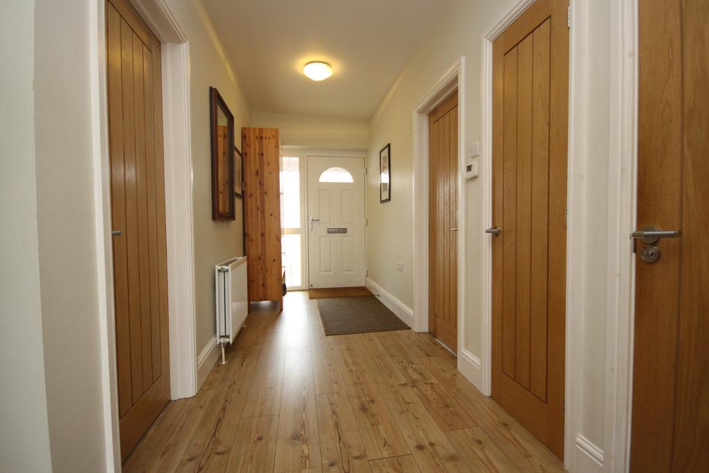 L-SHAPED HALL 16’ 5” x 8’ 10” (5.00m x 2.69m) (max. overall L-shaped measurement), uPVC double glazed door & screen, fitted cloaks cupboard & double-banked radiator.