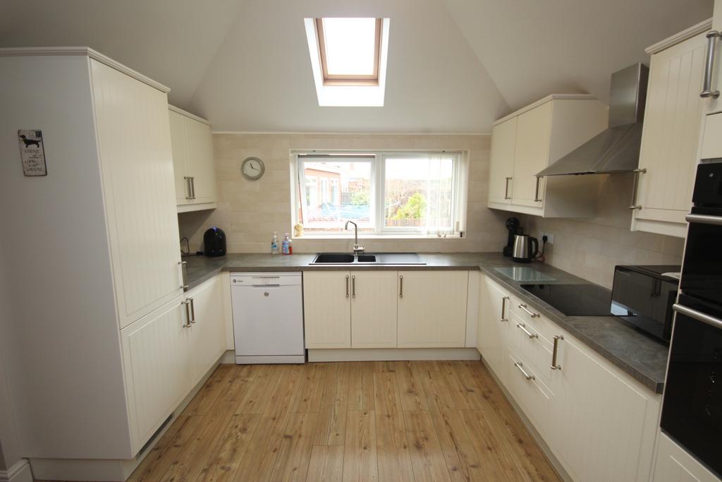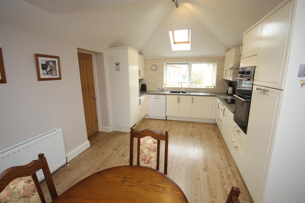 EXTENDED DINING KITCHEN 17’ 8” x 11’ 0” (5.38m x 3.35m) part-tiled walls, fitted wall & floor units, illuminated working surfaces, induction hob, stainless steel extractor hood, ‘Hotpoint’ eye-level double oven, 1½ bowl sink & drainer, integrated fridge & freezer, pull-out larder, plumbing for dishwasher, 4 spotlights on track, double-banked radiator, vaulted ceiling with ‘Velux window & uPVC double glazed window with vertical louvred blind.