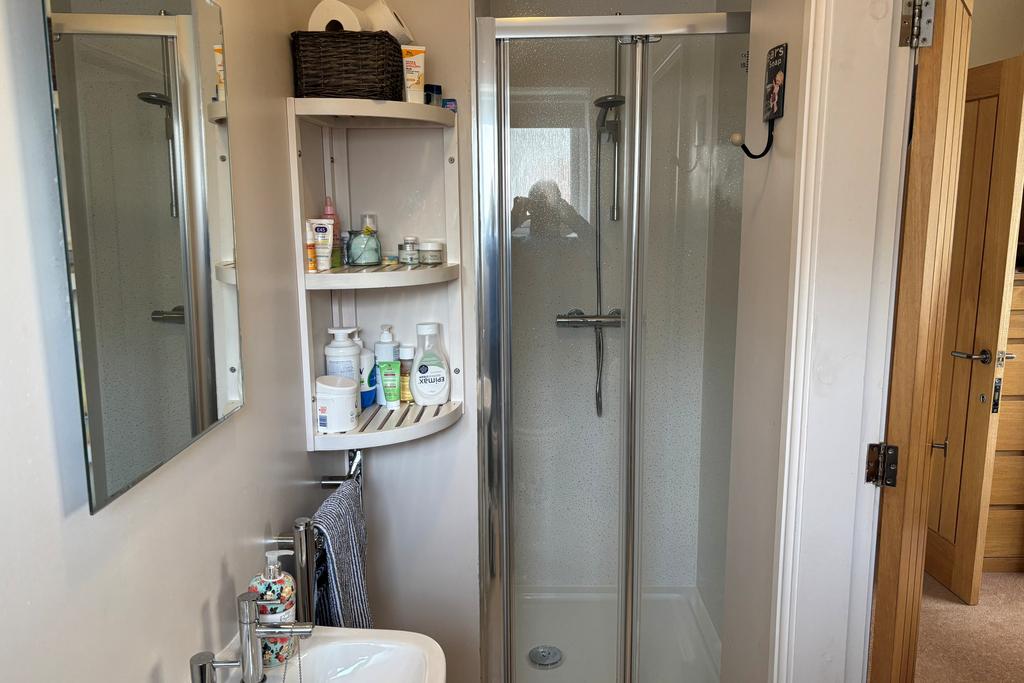 EN-SUITE SHOWER ROOM tiled floor with under-floor heating, fully-tiled walk-in shower cubicle with mixer shower, pedestal washbasin, low level WC, radiator & uPVC double glazed window with roller-blind.