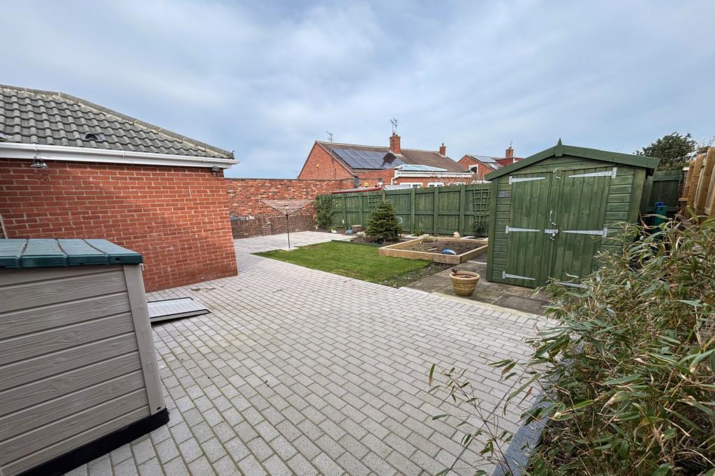 GARDENS the front is fully-blocked paved providing standage for up to 3 cars, the rear garden measures approximately 43ft x 35ft (13.11m x 10.67m) with has part brick/part fenced boundaries, shaped lawn, borders, paved patio & walkways, wood shed 14ft x 6ft which is currently used as a work shop, and has an open aspect.