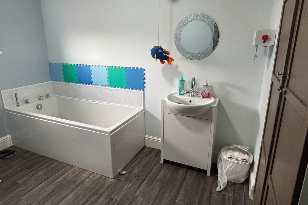 BATHROOM 11’ 9” x 8’ 8” (max. overall measurement) panelled bath with shower attachment on taps, vanity unit, low level WC, fitted store cupboard, double-banked radiator, extractor fan, uPVC double glazed window with roller-blind & access to loft space.