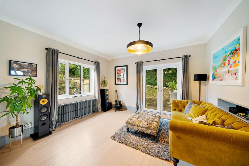 The heart of the home is a bright and expansive living / family room with clean, contemporary lines and double patio doors opening onto a generous sun terrace, perfect for entertaining or simply enjoying the outlook. Original Crittall doors lead into a stylish sunroom, and notably the property benefits from approved planning permission to remodel and enhance this sunroom, offering the incoming buyer a ready-made opportunity to further increase space, light and value.