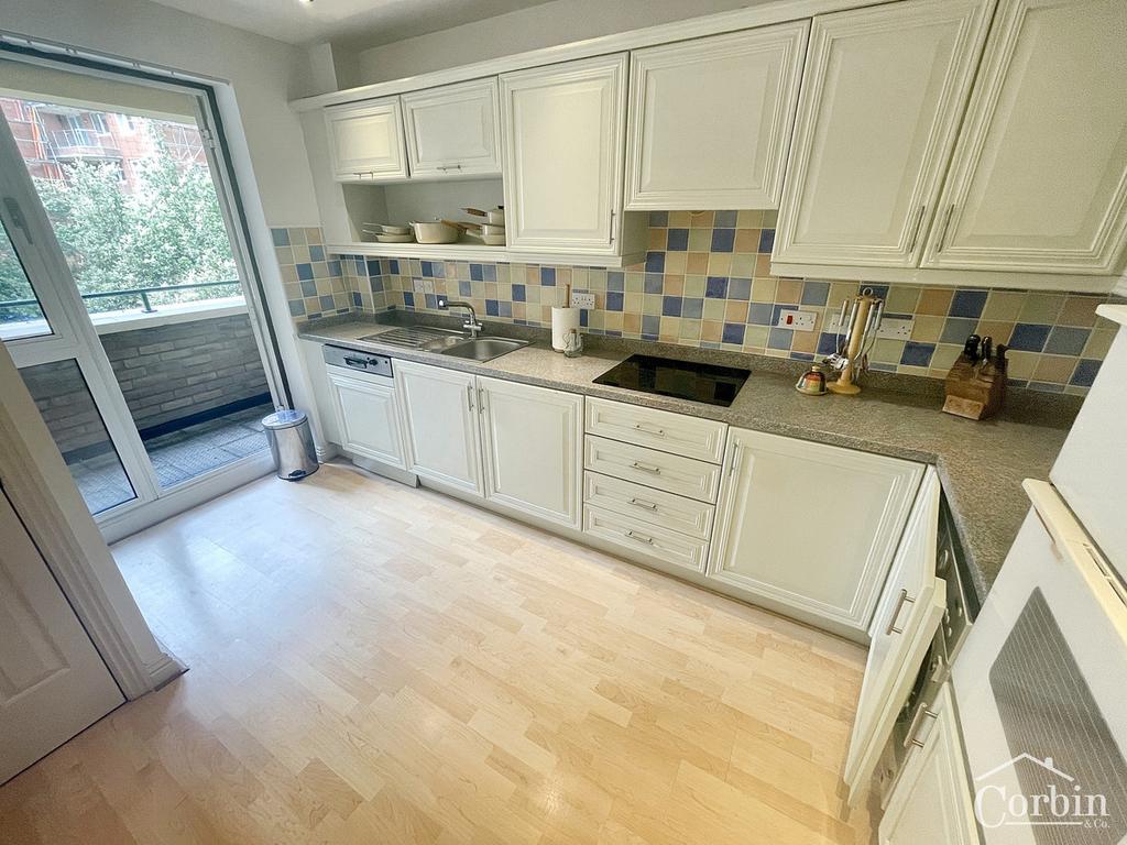 The separate kitchen is well-equipped with a good range of eye and base level cupboards, ample working surfaces, and an inset electric hob. Additional features include a fitted eye-level oven, fridge/freezer, washing machine, and dishwasher. A single door leads to the apartment's second balcony, an ideal spot for enjoying morning coffee.