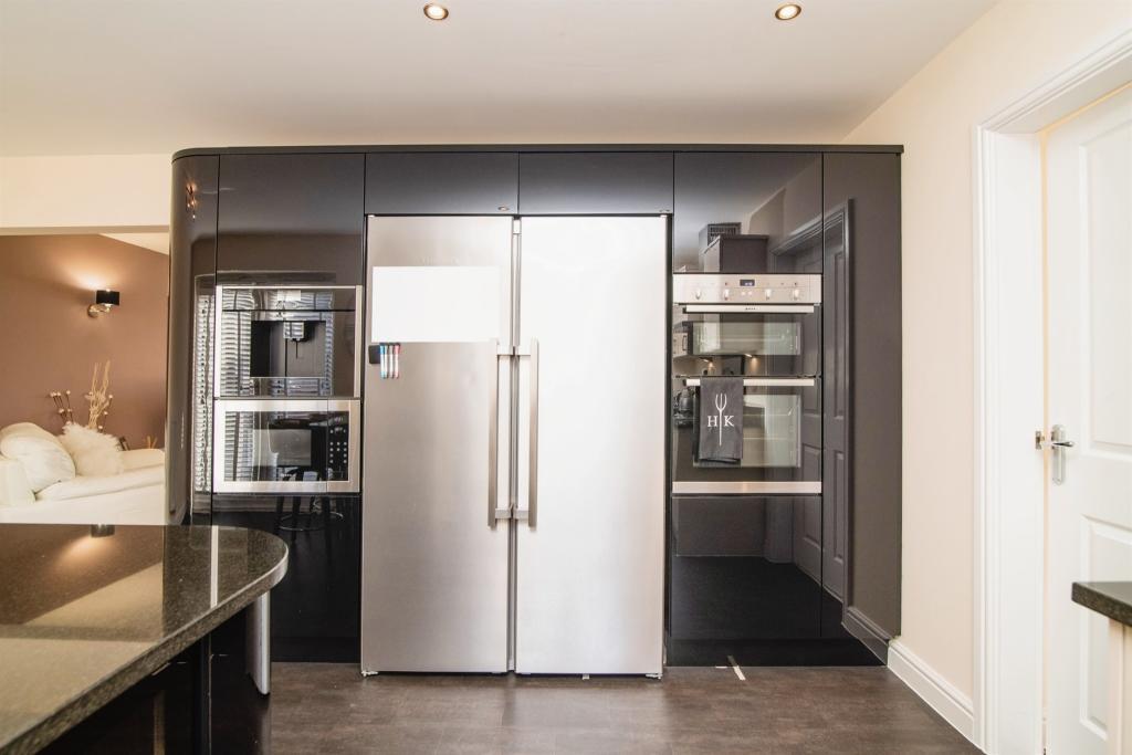 A fitted kitchen with a range of wall and base units to include work surfaces over, sink drainer, electric oven and gas hob with cooker hood, integrated microwave, integrated coffee machine, integrated dishwasher, double glazed window to the rear, double glazed french doors leading to rear garden.