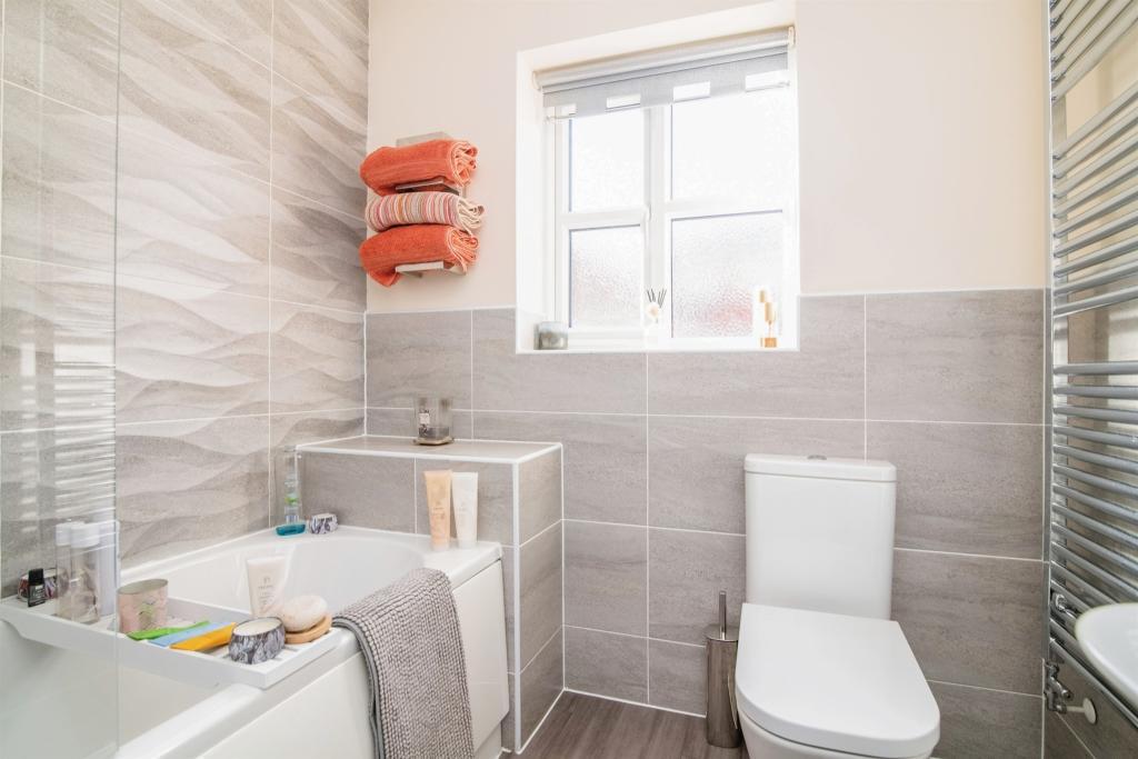 Suite to comprise bath with shower over, wash hand basin, low level w.c., towel rail, part tiled walls, double glazed window to the rear.