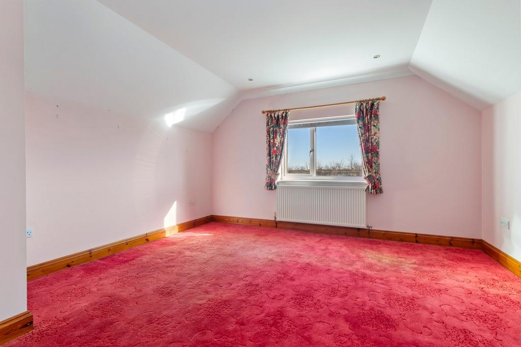 A spacious double bedroom with carpeted flooring, a window to the side aspect with views over the fields and integrated wardrobes.
