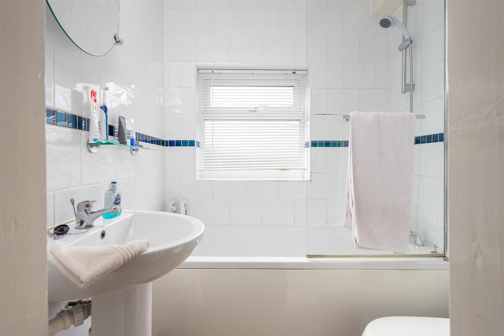 Bathroom - 1.50 x 1.70 (4'11" x 5'6") - White bathroom suite comprising of a bath with mixer shower and glass screen, pedestal basin and WC, with tiled walls, radiator and uPVC window.