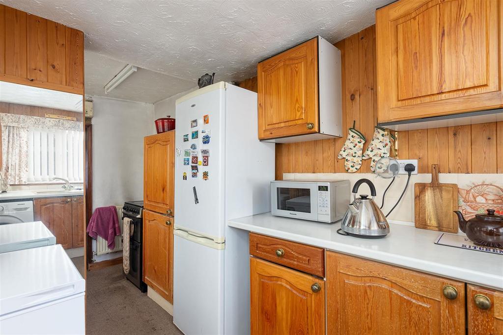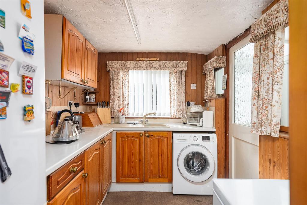 Kitchen - 4.65 x 2.00 max (15'3" x 6'6" max) - Pine fitted kitchen units with matching veneer wall panelling, contrasting white worktops and tiled splash backs, with a composite sink and drainer with mixer tap, space for a free standing cooker, plumbing for a washing machine and space for a vertical fridge freezer. With a radiator, rear facing uPVC window and an internal door and windows to the rear porch.