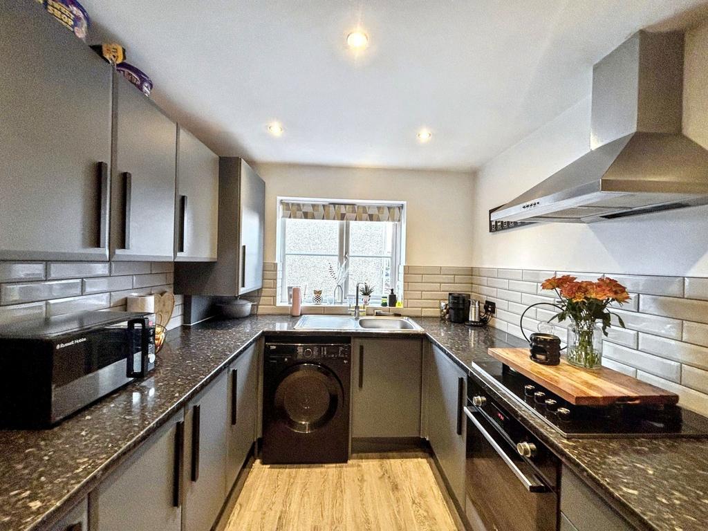 Fitted with a range of wall and base units with complementing work surfaces and splash back wall tiling. Built-in appliances include: gas hob, electric oven and extractor hood, space and plumbing for washing machine, space for fridge/freezer and a sink unit with mixer tap and drainer board, double glazed window to the side.