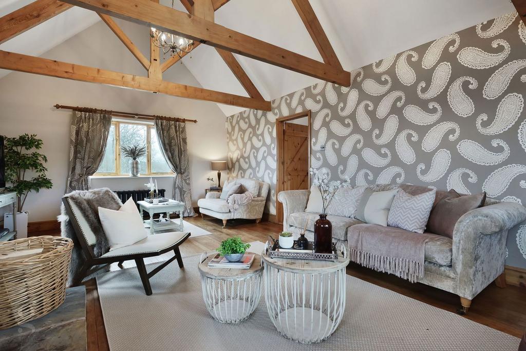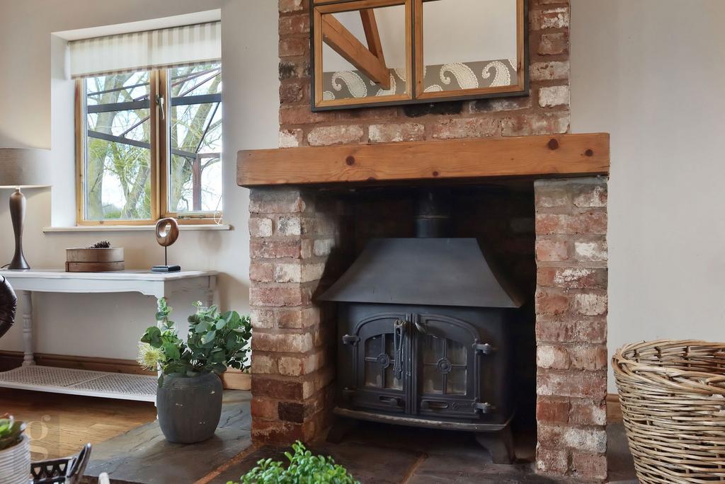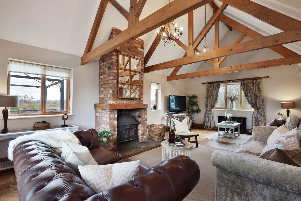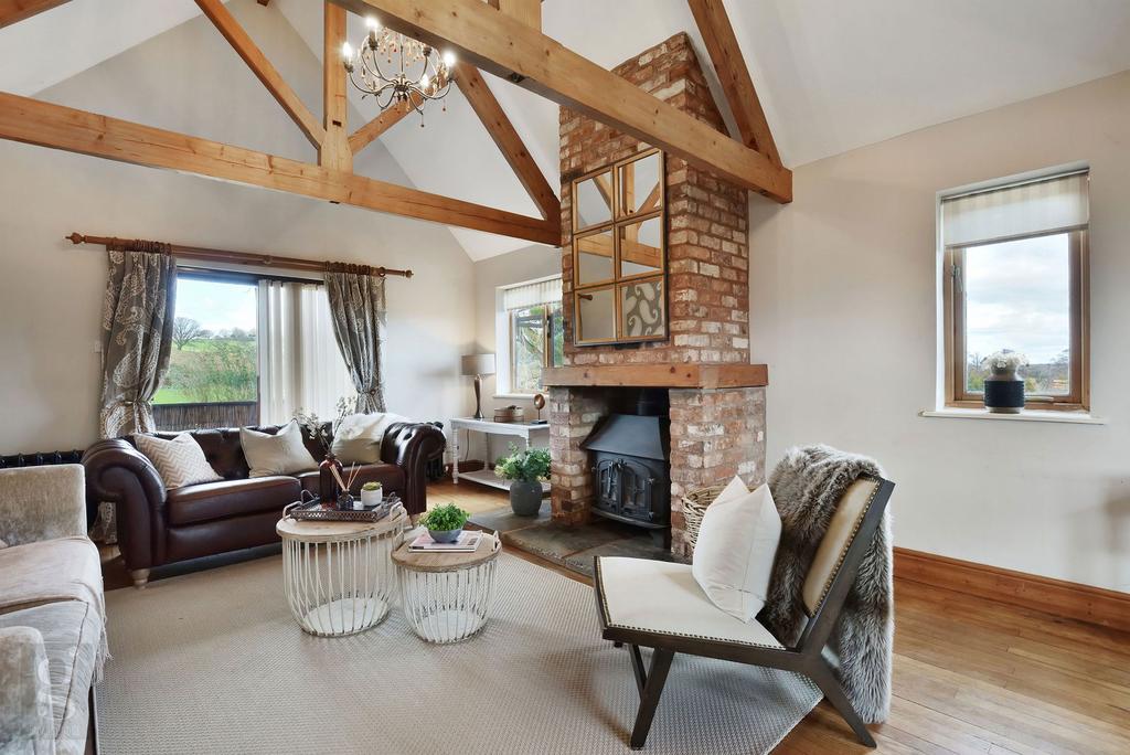 Sitting Room: This impressive 7-metre-long sitting room boasts striking Kingpost beams and a wood-burning stove set atop a slate hearth, serving as a focal point for this generous family space. Oak floorboards extend towards sliding doors that open onto the balcony.
