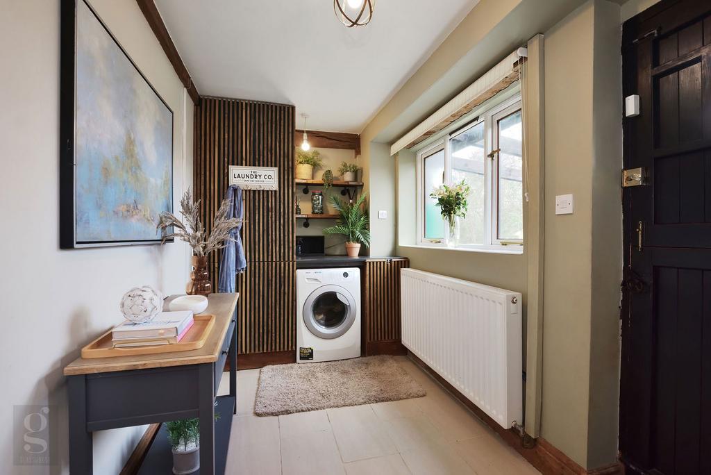 Utility Room: Entering from the driveway through a large stable door, the utility room features fitted units, a boiler housed in the corner, and space for a washing machine beneath, all completed by tile flooring.