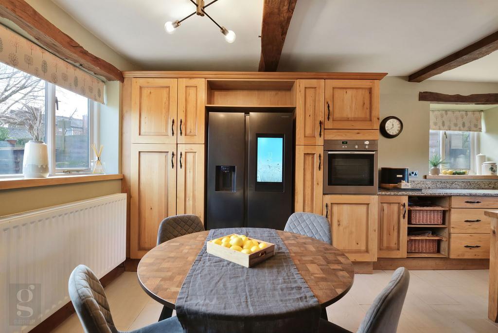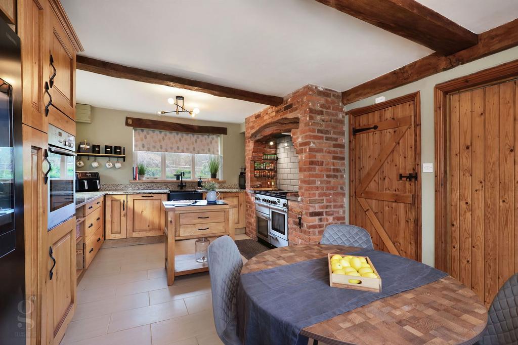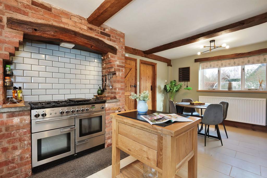 Kitchen/Breakfast Room: Tiled flooring seamlessly flows from the utility into the kitchen, which is fitted with built-in oak units and worktops spanning three walls, providing generous culinary workspace. A black Belfast sink with a built-in Quooker tap is set beneath a large window, with further integrated appliances including a dishwasher and fan oven. Marble countertops extend to a large brick surround with oak lintel above, housing a 6-point gas Rangemaster, creating a commanding presence in the kitchen.