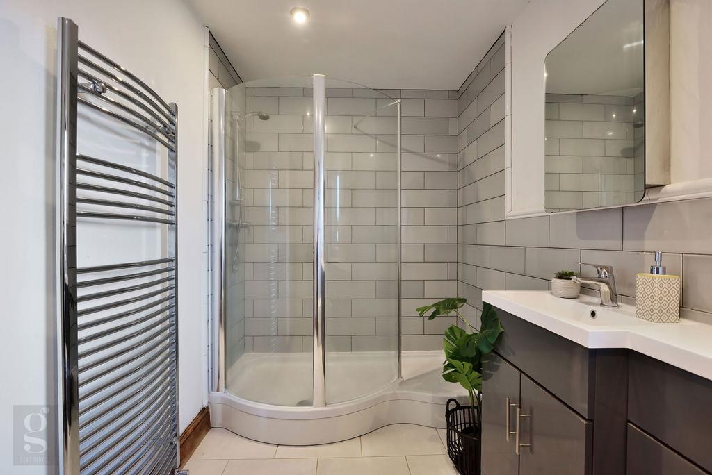 Downstairs Shower Room: Completing the potential annexe space, this well-appointed shower room includes an oversized walk-in thermostatic shower, a chrome heated towel rail, a low-flush WC, and a handwash basin with built-in storage. Underfloor heating ensures added comfort.