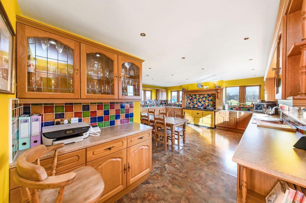 A wonderful room, once again, with windows to the front and rear, stunning views out over the gardens and beyond, four wall lights, a central ceiling light point, and a beautiful antique brick fireplace. This with raised stone flagged hearth has a timber beam within, and all is home for a large log-burning cast-iron stove with twin glazed doors. Across the hallway, a door leads through to the fabulous dining/living kitchen.
