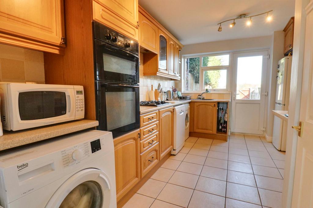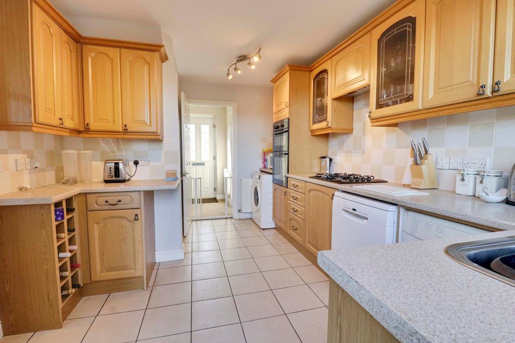 14' 0" x 9' 10" (4.27m x 3.00m) with a double glazed window to rear providing excellent views over the garden and rolling countryside beyond and door to rear. The kitchen comprises a 1½ bowl single drainer sink with a monobloc tap above and cupboard under, further range of matching base and eye level units with a worktop over, integrated four ring gas hob with a double oven and grill to side, extractor hood and light above, recess and plumbing for dishwasher, recess and plumbing for washer/dryer, wine rack, position for fridge/freezer, understairs storage cupboard, double panelled radiator, tiled flooring.