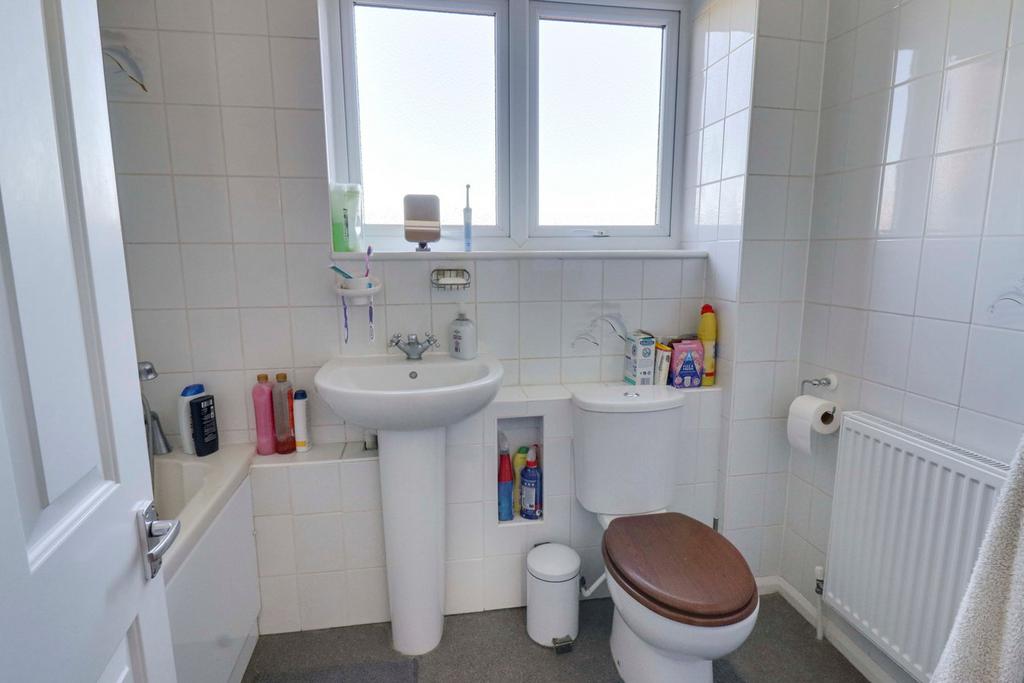 Comprising a panel enclosed bath with hot and cold taps, fitted shower attachment and a wall mounted power shower, pedestal wash hand basin, flush WC, fully tiled walls, single panelled radiator, towel rail, wall mounted corner cabinet with mirror, opaque double glazed window to rear, extractor fan, fitted carpet.