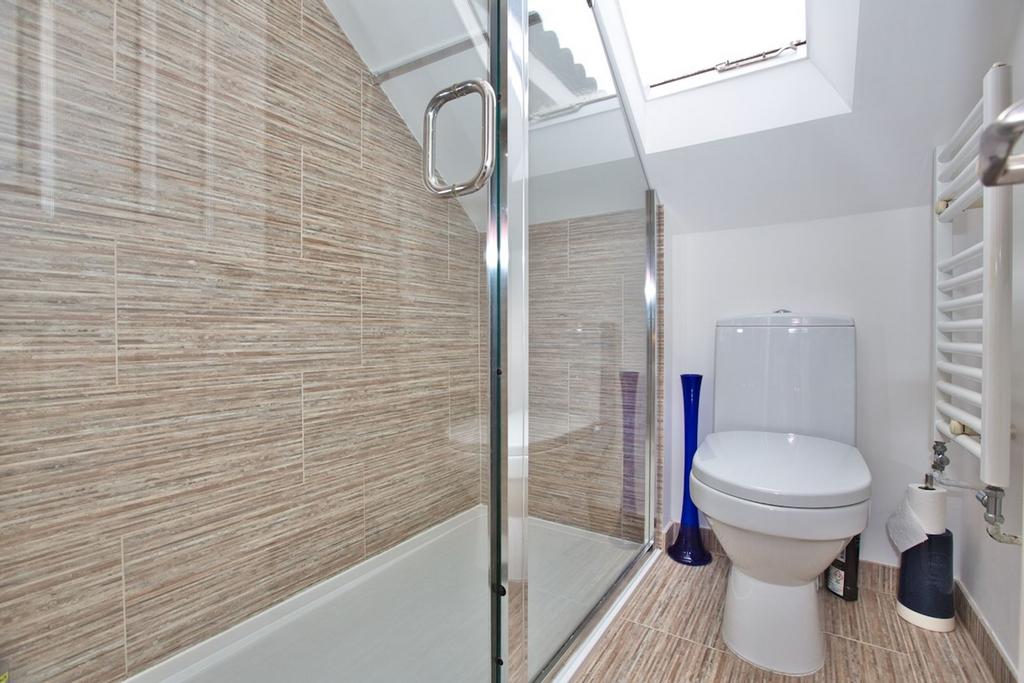 A modern shower room featuring a walk-in shower, toilet, sink, and heated towel rail. The skylights allow natural light to flood the space.