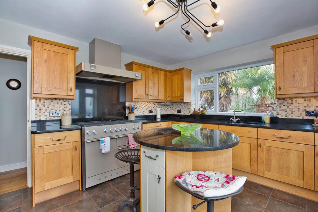 A spacious kitchen boasting patio doors that lead onto a charming decking area. The kitchen features an island, built-in dishwasher, and fridge, as well as tiled flooring and ample worktop space