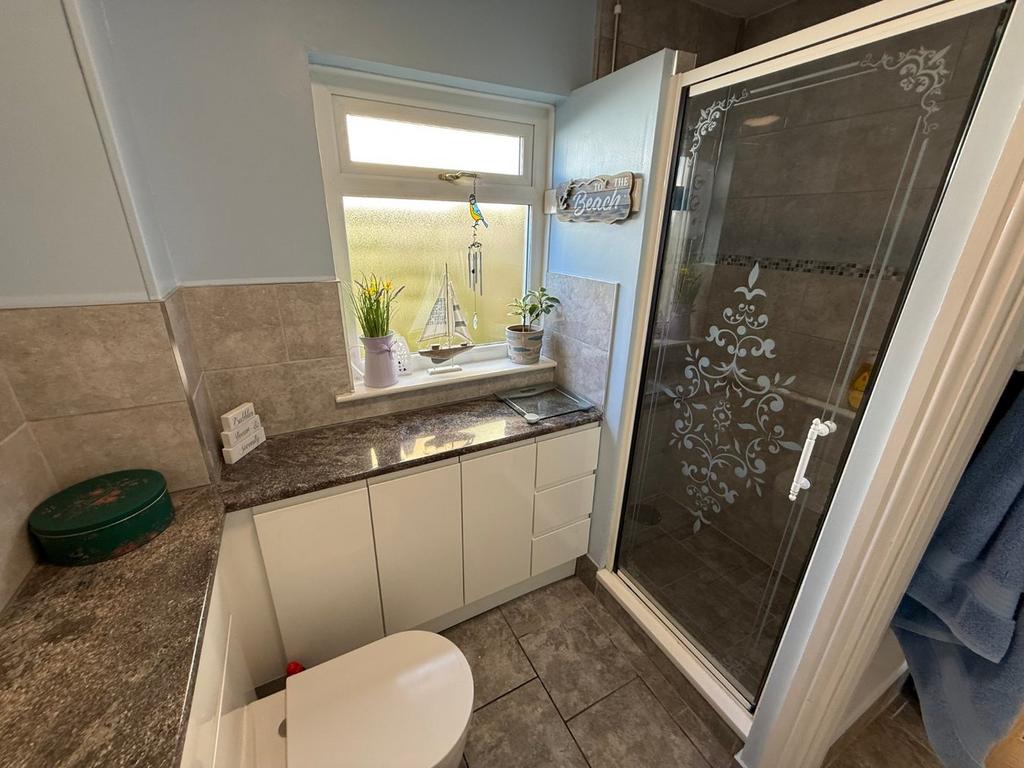 7' 2" x 8' 2" (2.18m x 2.49m) A modern white suite comprising of an enclosed shower unit with Triton electric shower above, concealed low level flush w.c., wash hand basin, glass white cupboard units and worktop, heated towel rail, frosted window to side, half tiled walls, tiled flooring, extractor fan.