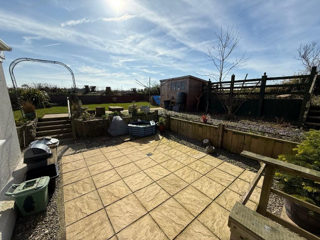 The garden is laid to 2 tiers. the lower tier offers a patio area laid to slabs with raised beds and dwarf stone walls.