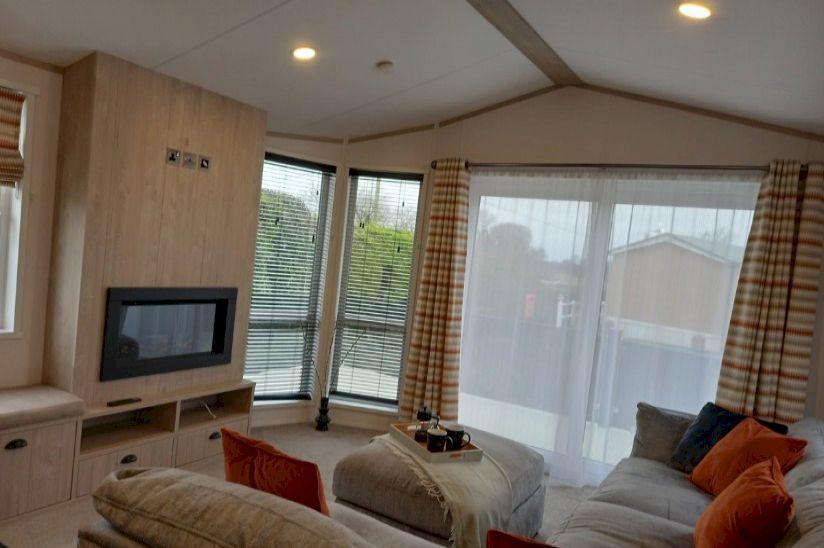 The living room features two full height windows next to the front sliding patio doors which let natural light flood in. This creates an inviting space to relax on the L shape sofa. This airy lounge area is finished with foot stool and feature electric fire.