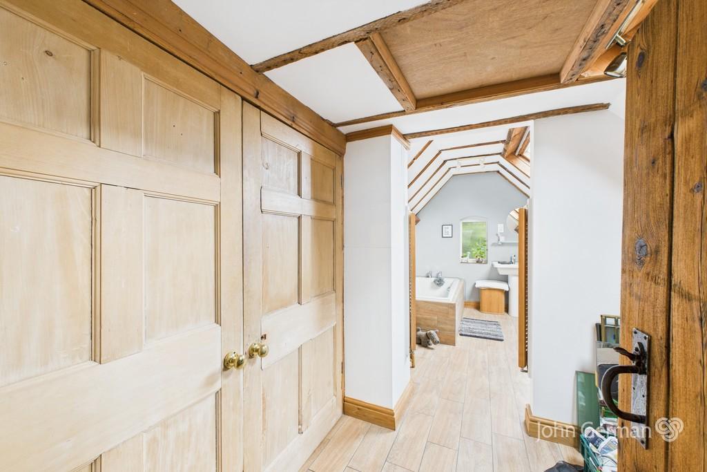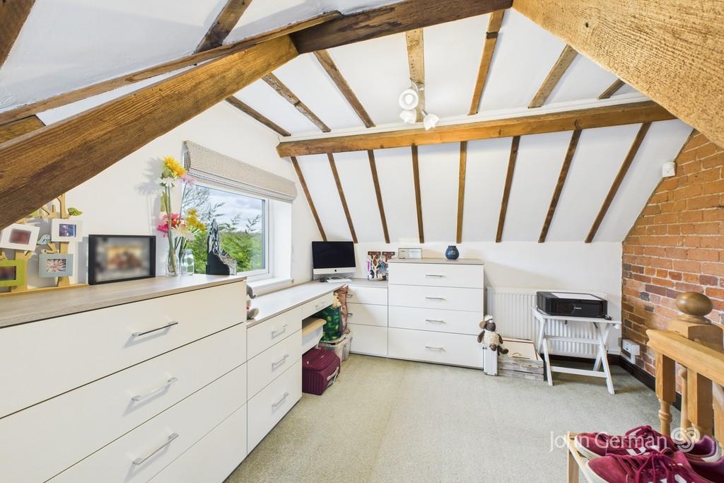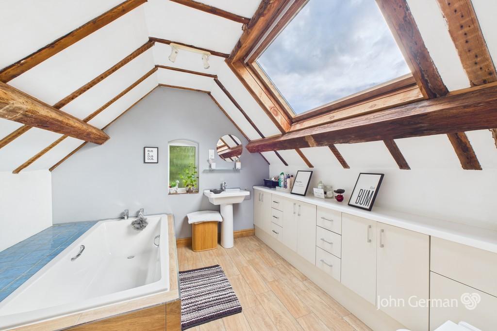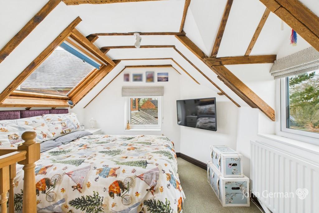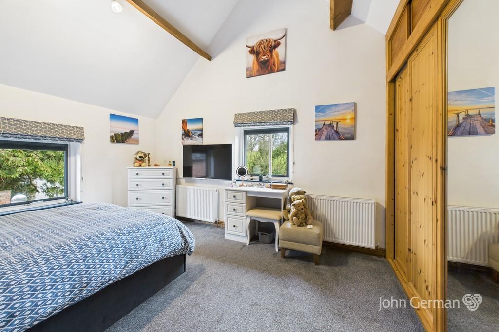 Off this landing are two further character double bedrooms with high ceilings and windows overlooking the garden together with the master bedroom which again has a high vaulted ceiling with splendid, exposed purlins, dual aspect windows and a range of fitted wardrobes and storage cupboards.