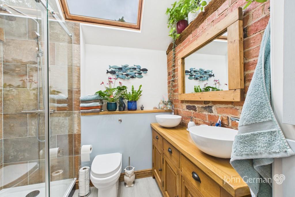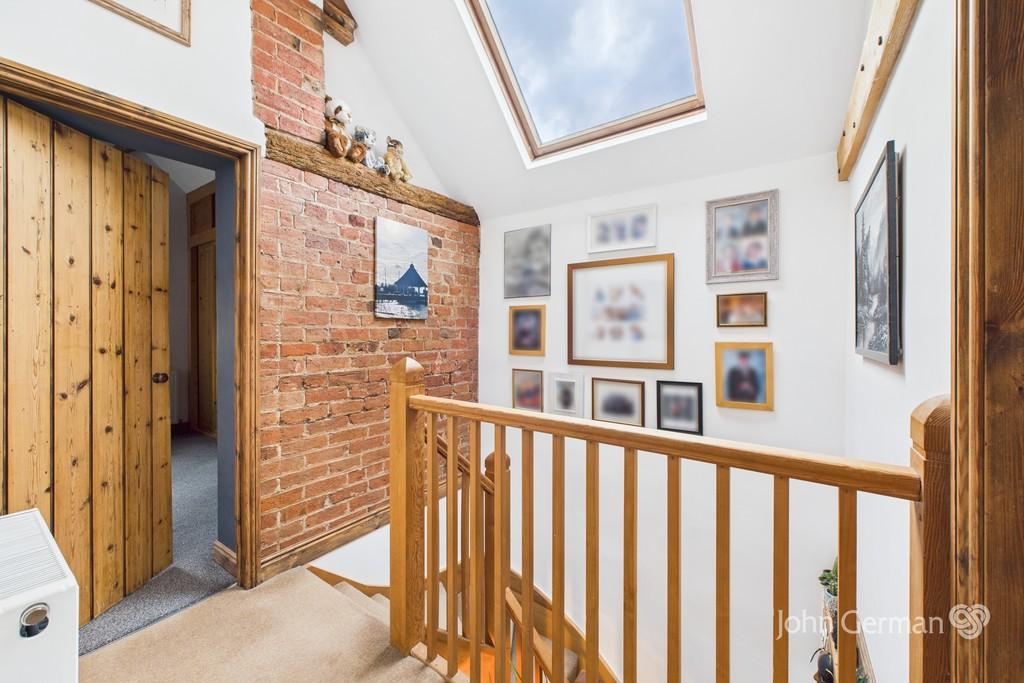 The principal stairs lead off the lounge area to a landing having balustrade, exposed wall timbers and a large Velux window flooding natural light. There is an attractive contemporary styled shower room having a large walk-in tiled shower with rain head and glazed screen, integrated WC and oak vanity unit with twin wash hand basins surface mounted with mixer taps, exposed brickwork and timber, and a large Velux window. There is a chrome heated towel rail and an airing cupboard housing the pressurised hot water cylinder.