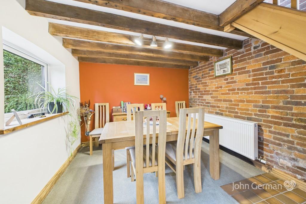 Immediately in front of you is a sitting room having a bay window overlooking the garden, and half glazed door and stairs off with exposed beams and brickwork. There is a wide opening into a separate dining room, again with beams and a window overlooking the garden.