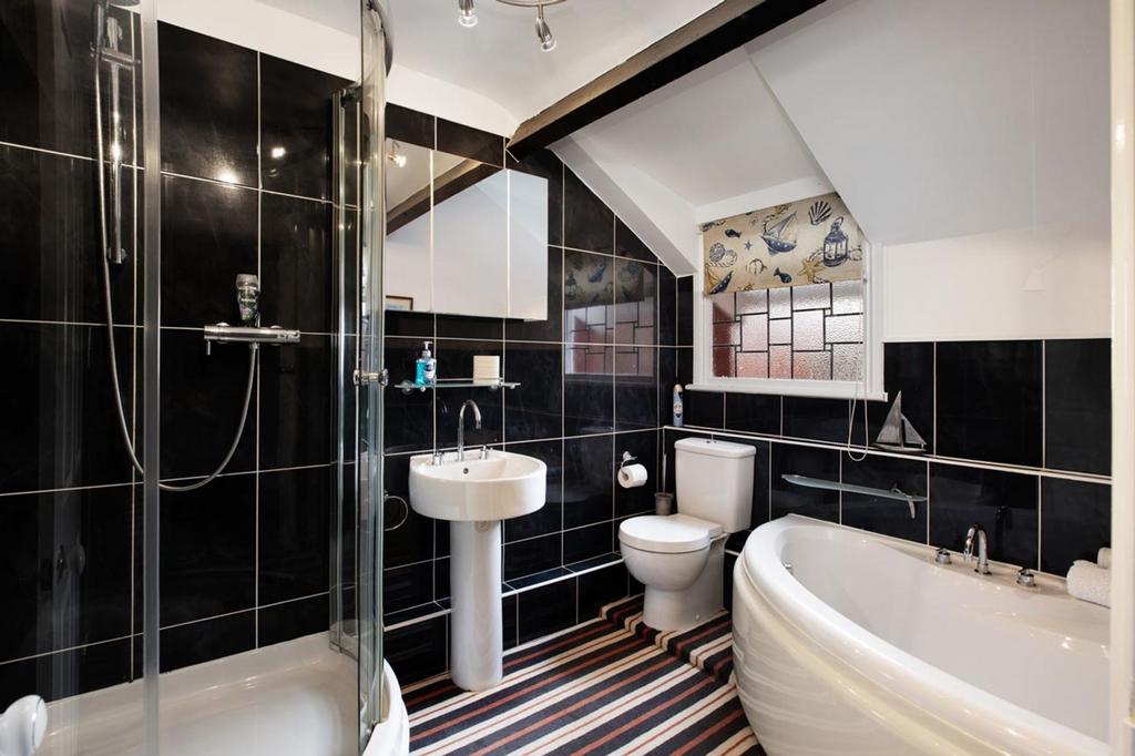 The spacious bathroom is fitted with a modern four piece suite with full height ceramic tiled surrounds with the suite having a corner set bath with mixer set and a separate shower cubicle with dual controls. In addition there is an opaque glazed leaded window, a medicine cabinet and a ladder style radiator/towel rail.