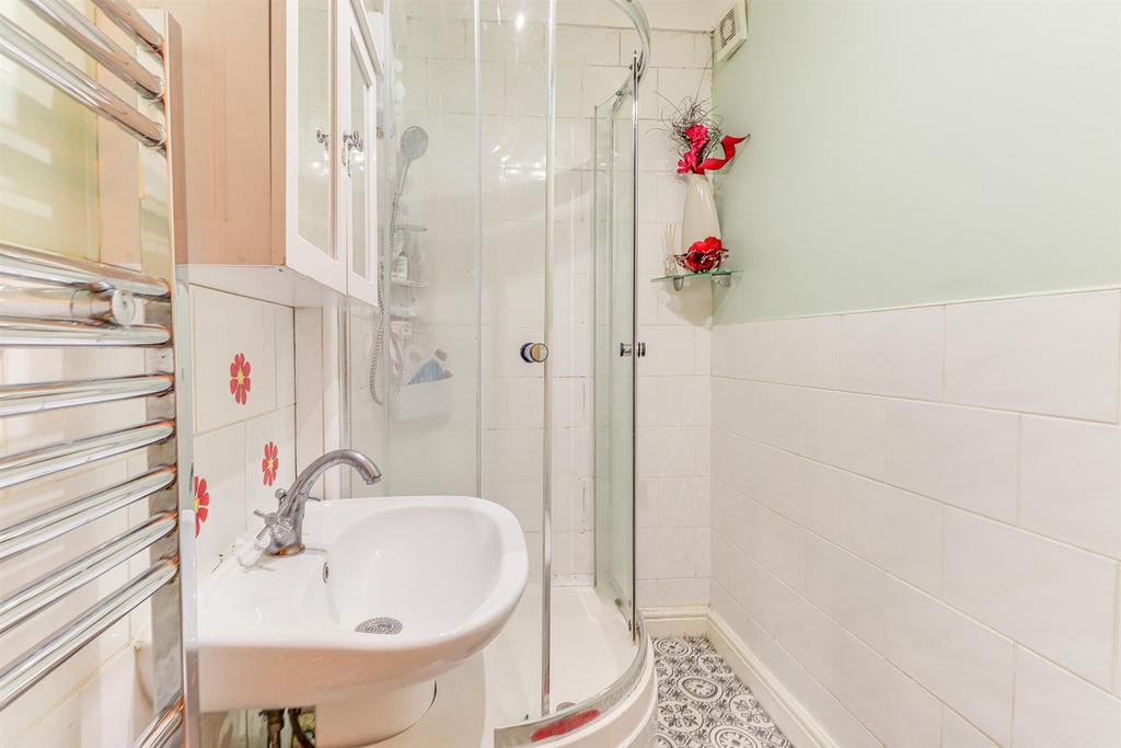 Downstairs Shower Room - 2.13m x 1.35m (7'0 x 4'5) - Smooth coved ceiling, corner shower, pedestal wash basin, low-level w/c, chrome heated towel rail, part tiled walls, lino flooring.