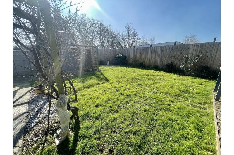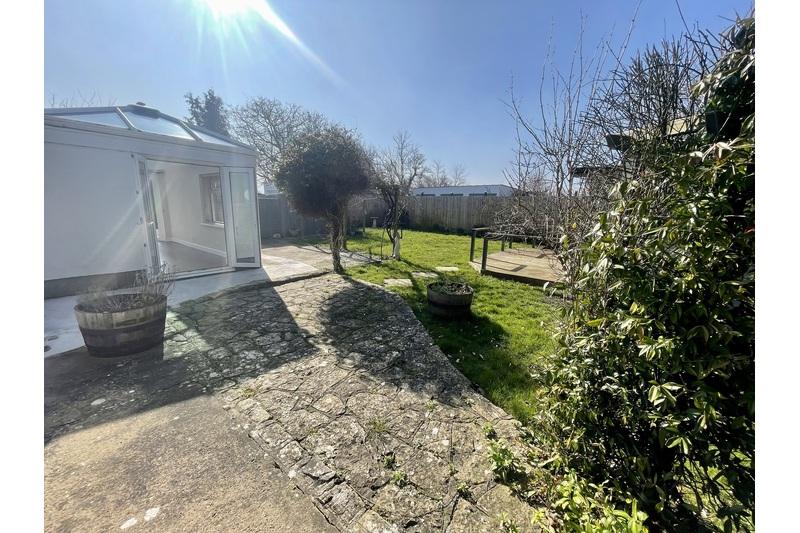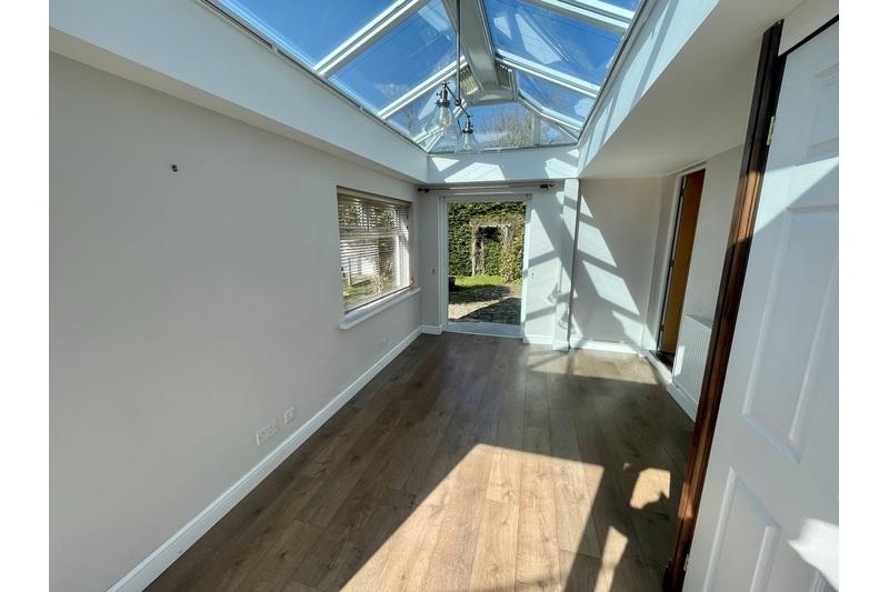 The accommodation comprises an entrance hall, sitting room, kitchen, sunroom, two well-proportioned double bedrooms, and a family bathroom. The property is accessed via a private driveway offering ample parking and a detached garage. The gardens are mainly laid to lawn with a patio, a decked area, and a selection of mature trees and shrubs.
