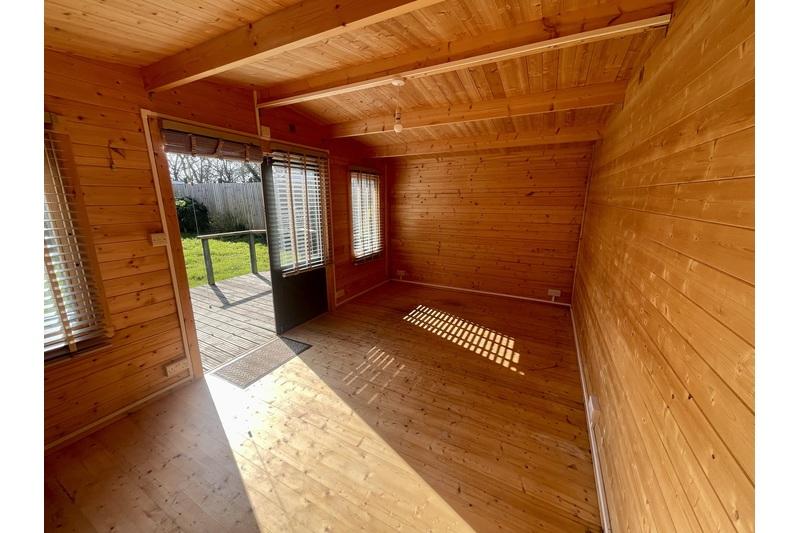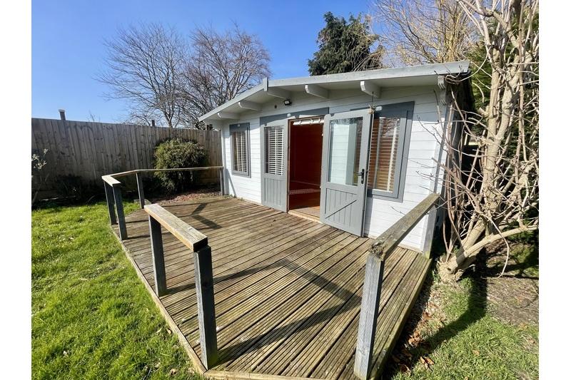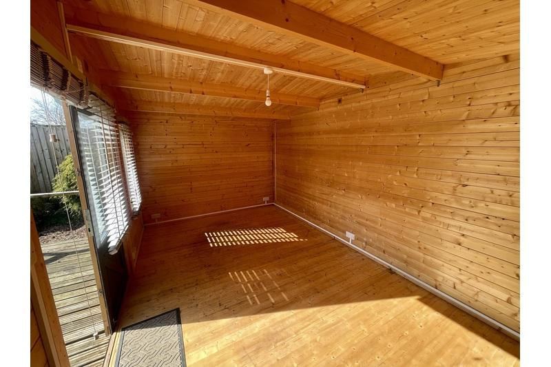 A modern garden room, equipped with lighting and ample power sockets, sits in the rear garden—perfect for use as a home office or hobby room.