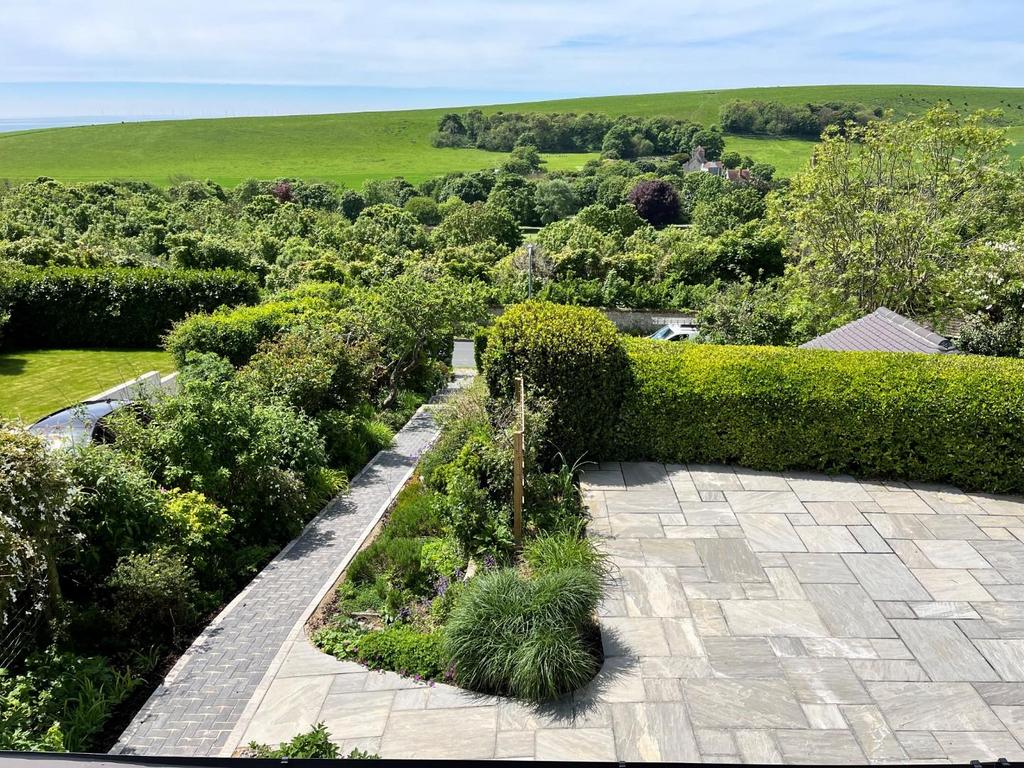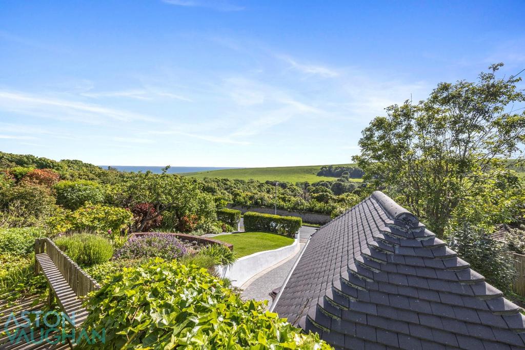 The House: - Set well back from the road on the cusp of the hill, this newly renovated home is impressive on approach with an immaculate front garden facing south, enjoying direct sea and countryside views to the south. Bathed in sunshine, space has been created on the slate patio for alfresco dining as the sunsets, surrounded by lush green borders for privacy. Glazed bi-folding doors link the outside with in, or the main front door opens to an elegant, double aspect living room where the open staircase with glass wall allows the light to filter through from east to west. The drive sweeps up the side of the house to the garage which offers secure parking for precious motorbikes and cars alongside storage for bikes and water sport equipment for those taking full advantage of the seaside location.