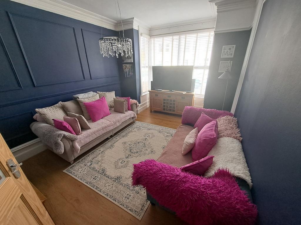 Ornate coving. Picture rail. Feature wall panelling. Double radiator. Wood laminate flooring. Sockets with USB ports. Wide triple aspect square bay with large UPVC double glazed windows.