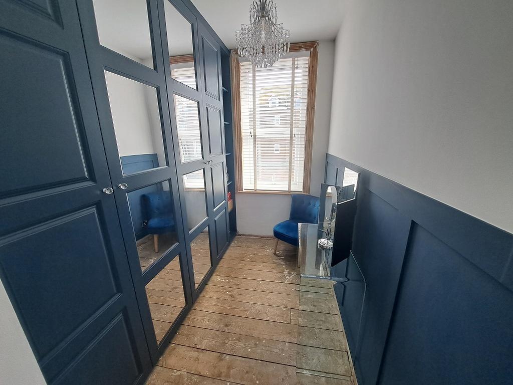 Bespoke range of fitted furniture comprising two floor to ceiling double wardrobes and a tall open shelf display unit. Large UPVC double glazed window.