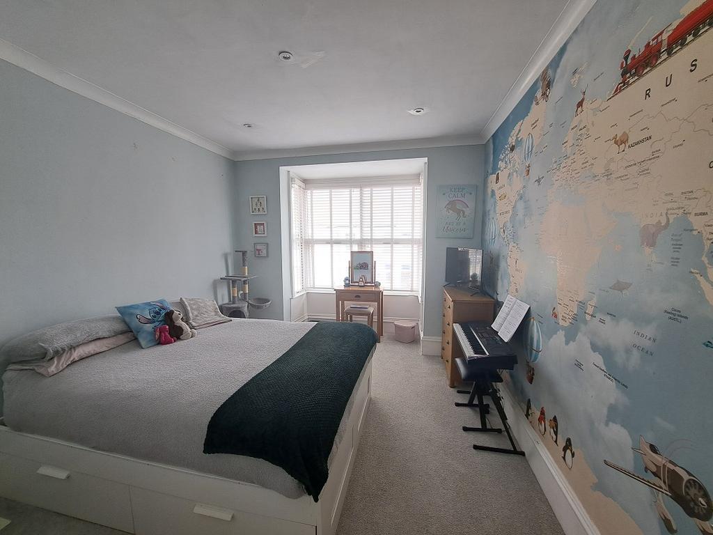Double radiator. Coved ceiling. Five recessed ceiling spotlights. Wide triple aspect square bay with large UPVC double glazed windows and pleasant outlook towards the