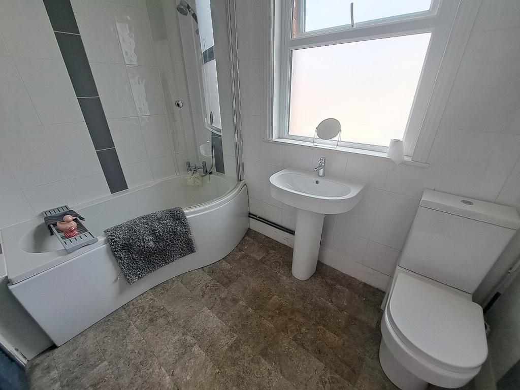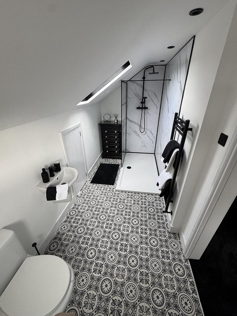 Stylish modern white suite comprising a dual flush push button WC unit, a wall mounted wash hand basin with mixer tap and a large double size walk-in shower with fitted shower unit. Four recessed ceiling spotlights. Built-in eaves storage area. Double glazed Velux window to the side and a UPVC double glazed window to the rear.