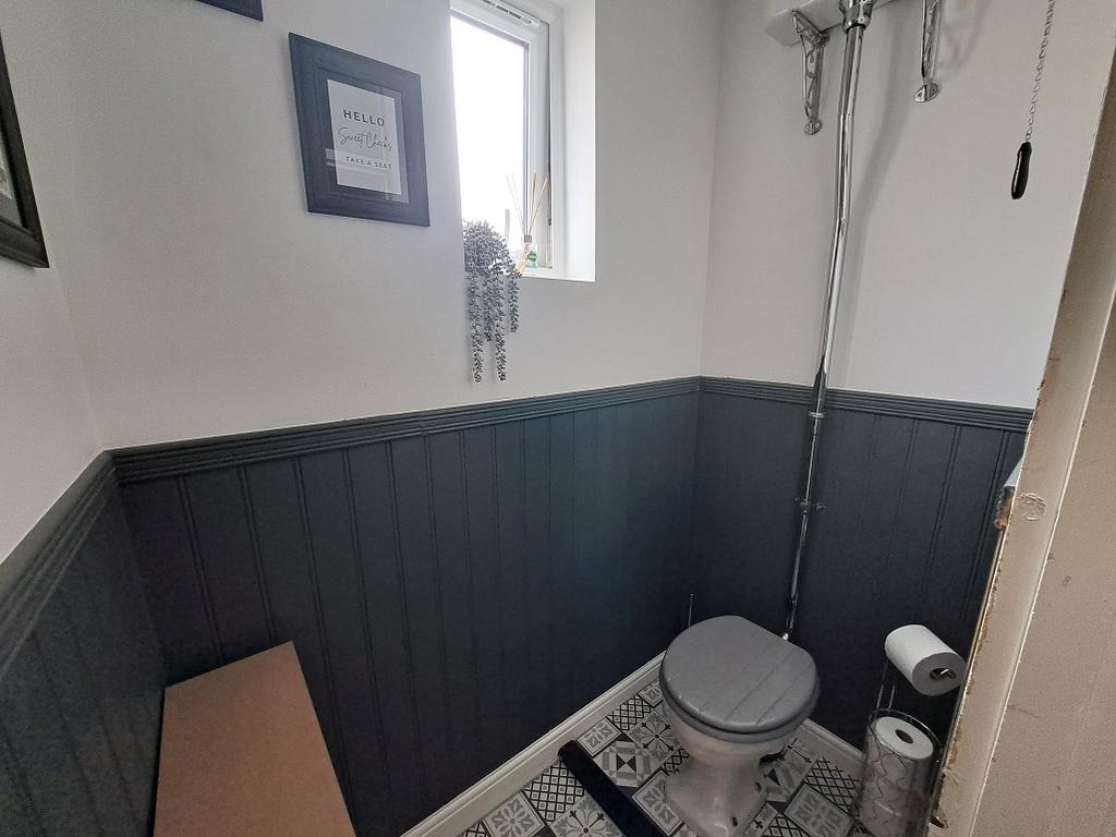White period style high level flush WC unit. Dado rail with panelling below. Radiator. Attractive tiled floor. Opaque UPVC double glazed window.