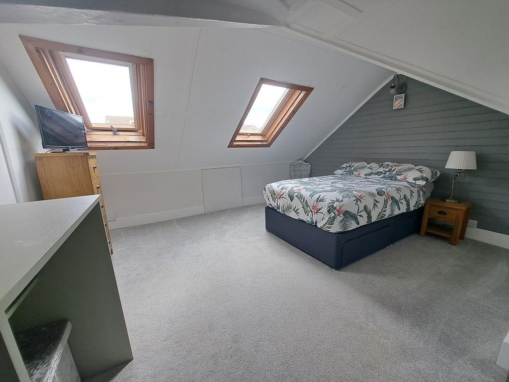 Radiator. Bespoke range of fitted wardrobes with drawers under. Two double glazed Velux windows to the front which provide sea views. Door to: