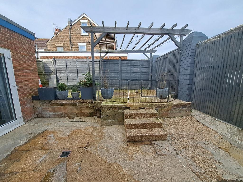 Laid to two levels of patio. Outside light. Walled and fenced boundaries. Tall double gates at the side provide: